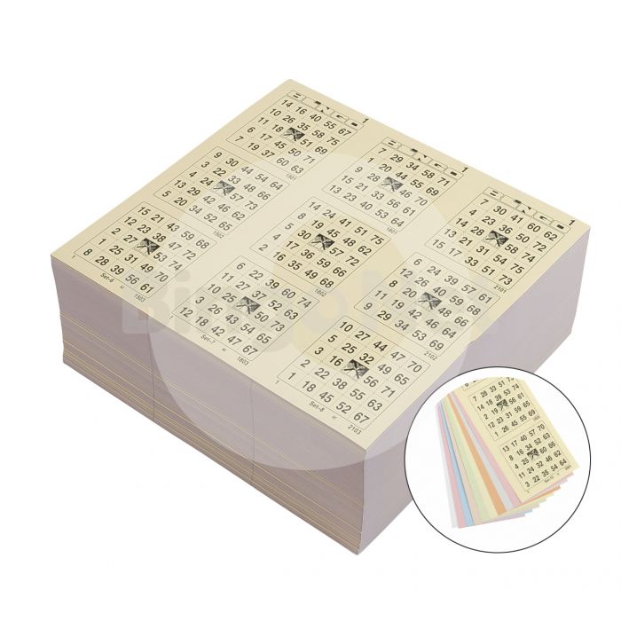 Elke pak bevat 100 boeken van 10 blaadjes per stuk met blaadjes in 8 verschillende kleuren. Ieder boekje heeft 10 blaadjes met daarop een rondenummer (geschikt voor het spelen van 10 bingoronden).