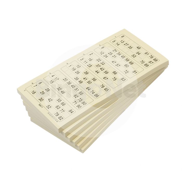 Een pak bingotickets bestaat uit 6 x 100 vel in dezelfde kleur. Ieder vel heeft 6 tickets en elk pak heeft één kleur.